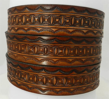 1 1/2" wide.  All of our belts are made of quality, top grain 9/10 ounce heavy tooling leather and proudly hand finished with our exclusive sixteen step finishing process. Available in solid black or dark edge with brown center. Gavere Leather belts are made in USA.