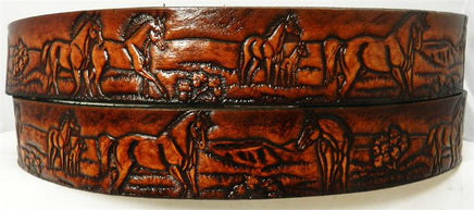 1 1/4" width. Continuous scene belts are airbrushed with a dark edge and blended brown center, then proudly hand finished with our exclusive sixteen step finishing process. All of our belts are 100% heavy duty top grain tooling leather. No composite, bonded or glued leather allowed in our factory. Gavere Leather belts Made in High Springs, Florida USA.