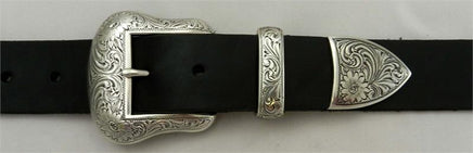 Looking to add a little rustic sparkle? Weve got just theWestern belt buckles for you! This thee piece buckle set features a stunningfloral design, boosting the look of just your average leather belt. Silver finishbelt buckles stand out against black leather, which is why this belt is sure tobecome an everyday staple!