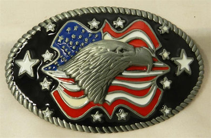 Buckle fits 1 1/2" belts. Patriotic American Flag oval buckle. Black epoxy background with eagle head in foreground & stars 3" x 5"