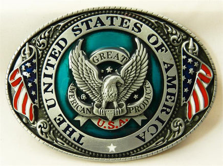 Buckle fits 1 1/2" Belt. Beautiful Oval Buckle with United States Seal has American flag on each side