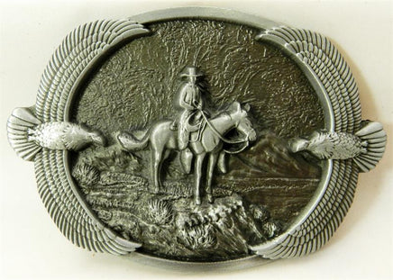 Buckle fits 1 1/2" Belt. Unique 3D antique nickel finish buckle. Cowboy in center surrounded by eagles