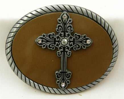Buckle fits 1 1/2" Belt. Oval Cross Buckle has cross with rhinestones on brown leather