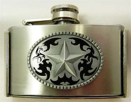 Buckle fits 1 1/2" Belt.  Detachable Decanter has 3D star on front.  Measures 2 1/4" x 4"