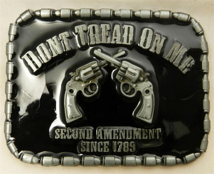 Buckle fits 1 1/2" belts. Patriotic Don't Tread on me buckle. Black epoxy with crossed revolvers