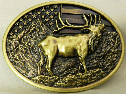 Buckle fits 1 1/2" Belt. Bronze Oval buckle has Elk with American Flag in background