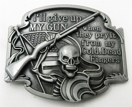 Fits 1 1/2" Belt. 3D Buckle says "I Will Give up my Gun When They Pry it From my Cold, Dead Fingers"