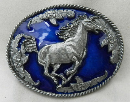 Buckle fits 1 1/2" Belt. Oval 2 1/2" x 3" horse running with blue enamel background