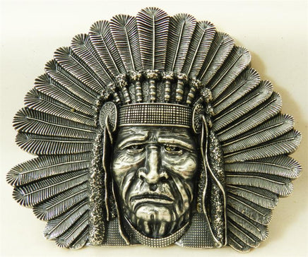 Buckle fits 1 1/2" Belt. Front view of Indian chief, antique nickel finish