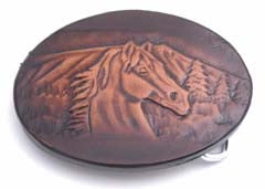 Fits 1 1/2" belt. Oval leather horse head buckle matches Leather belt & leather name belt #111