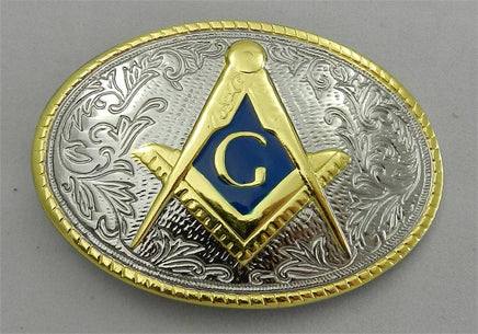 Buckle fits 1 1/2" Belt. Masonic emblem on oval silver buckle and gold edge