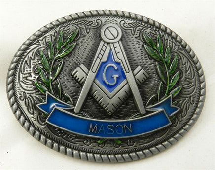 1 1/2" Oval Masonic buckle, antique finish with blue epoxy banner and green epoxy wreath