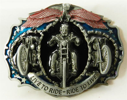 Fits 1 1/2" Belt. Ornate Motorcycle man front view with Live to Ride - Ride to Live