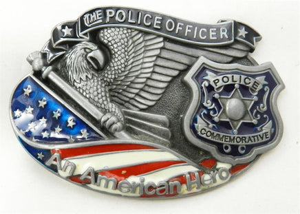 1 1/2" buckle with American flag, eagle police badge & "The Police Officer an American Hero"