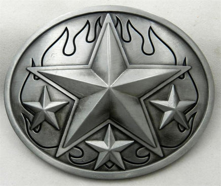 Large 3" x 4" antique nickle finish oval buckle with large 3D star in center & 3 smaller stars across the bottom