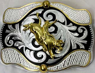 Fits 1 1/2" Belts - Large 3" x 4" Beautiful & decorative Bull Rider buckle with gold bull rider & gold rope edge