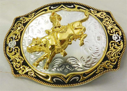 Fits 1 1/2" Belts - Small 2 x 3" Trophy buckle with gold Bull rider & gold rope edge
