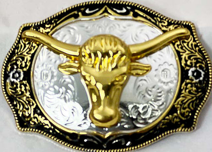 Fits 1 1/2" Belts - Large 3" x 4" Gold Steer head on black & silver background