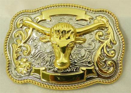 Fits 1 1/2" Belts - Large 3" x 4 " LG Trophy buckle with gold steer head & edging