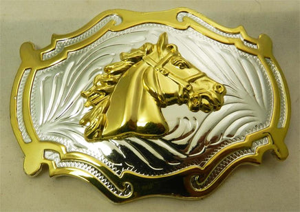 Fits up to 1 1/2" belts. Shiny extra large buckle with Horse Head in center