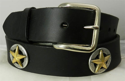 1 1/2" wide.  Large 1 1/2"  concho has gold 3D star in center. They are placed every 5-6" along solid black belt.  Belts will hold five to six conchos, depending on size ordered.