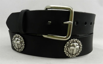 1 1/2" wide. Cross conchos are placed every 5-6" along solid black belt. Belts will hold five to six conchos, depending on size ordered.