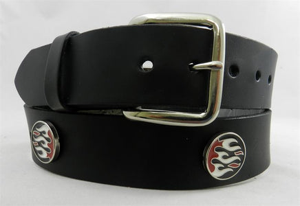 1 1/2" wide belt. The Flames conchos are placed every 5-6" along solid black belt. Belts will hold five to six conchos, depending on size ordered.