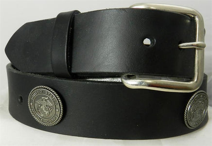 1 1/2" wide belt. U S Marine Seal conchos are placed every 5-6" along solid black belt.  Belts will hold five to six conchos, depending on size ordered.