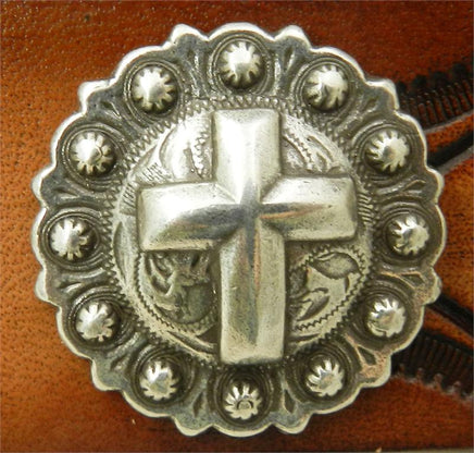 1 1/4" round concho with berries around edge and cross in middle. Screw post back.