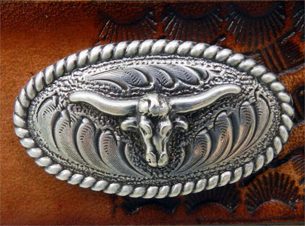 Oval Longhorn concho. Antique nickel with rope edge. 3/4" x 1 1/2". Screw back