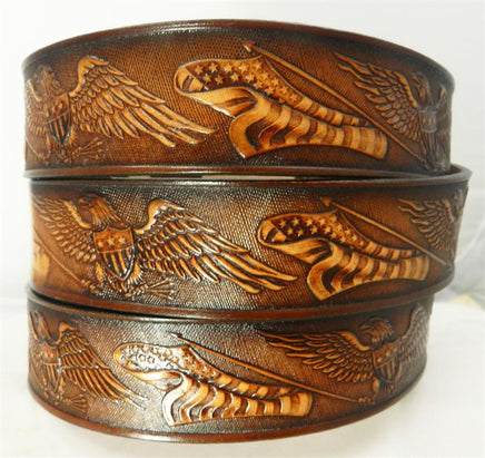 This new 1 1/2" wide Patriotic name belt design has American Eagles & American flags. During the design process of these handmade leather belts, we leave a blank space in the center back of belt to add your name, nickname, company name or wording of your choice.