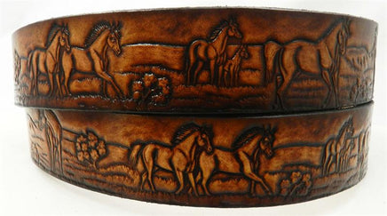 1 1/2"wide. Horses are embossed along the complete length of leather belt. Airbrushed a beautiful two tone brown.