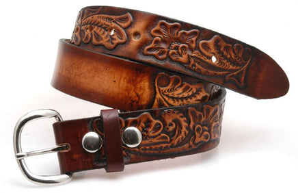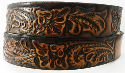 This belt is crafted from high-quality leather and features a two-tone brown design with a stamped pattern for added character.