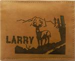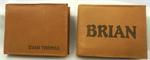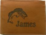 TAN trifold imported wallet can be personalized with name; deer scene & name; bass & name; or phrase. Great personalized gift for groomsmen. Very popular is the PULP FICTION wallet. We engrave the B__M__F__