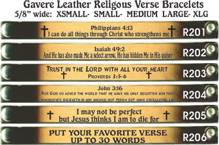 5/8" leather bracelet. You may also order your favorite verse or saying up to 30 words. Five sizes clasp with durable snaps.