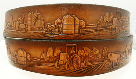Add a bit of country life to your everyday look. The Farm Scene Belt shows a detailed hand-tooled farm scene—tractor, barn, silo, and animals—all carved into 1½″ top-grain leather and airbrushed in warm, natural tones.