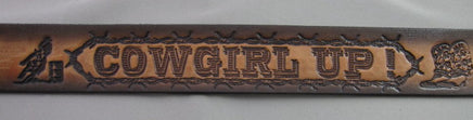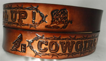 1 1/2" WIDE. Cowgirl Up. When designing name belts, we leave a blank space in the center back of belt to personalize with your name, nickname, company name or wording of your choice. Some designs are available in black edge w/grey center, but most are airbrushed a beautiful two tone brown. Like all of our belts, they are made of quality, top grain 9/10 ounce heavy tooling leather and proudly hand finished with our exclusive sixteen step finishing process. Gavere Leather belts are made in USA.