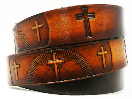 1 1/2" WIDE. When designing name belts, we leave a blank space in the center back of belt to personalize with your name, nickname, company name or wording of your choice. Cross belt is airbrushed a beautiful two tone brown. Like all of our belts, it is made of quality, top grain 9/10 ounce heavy tooling leather and proudly hand finished with our exclusive sixteen step finishing process. Gavere Leather belts are made in USA.