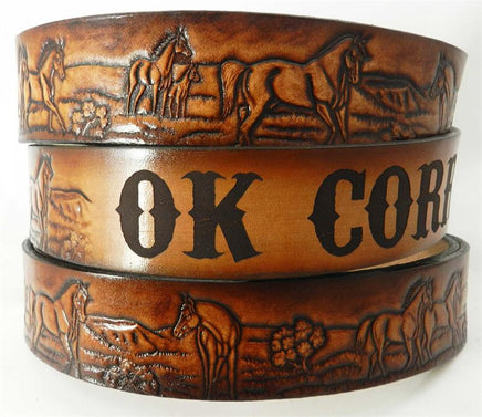 1 1/2" WIDE. When designing name belts, we leave a blank space in the center back of belt to personalize with your name, nickname, company name or wording of your choice. Horses, lots of horses belt is airbrushed a beautiful two tone brown. Like all of our belts, it is made of quality, top grain 9/10 ounce heavy tooling leather and proudly hand finished with our exclusive sixteen step finishing process. Gavere Leather belts are made in USA.