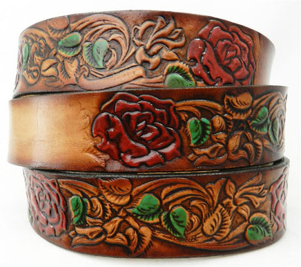 1 1/2" WIDE. This belt is handpainted. When designing name belts, we leave a blank space in the center back of belt to personalize with your name, nickname, company name or wording of your choice. Choose from red roses, pink roses or yellow roses. Belt is airbrushed a beautiful two tone brown. Like all of our belts, they are made of quality, top grain 9/10 ounce heavy tooling leather and proudly hand finished with our exclusive sixteen step finishing process. Gavere Leather belts are made in USA.