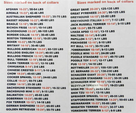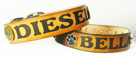 Dog Collars are airbrushed two tone brown. They are available in 1" wide or 1 1/4" wide. Leather is heavy 6-7oz. top grain cowhide leather and includes the Dog's name which is burned in with a laser. The option to add Conchos on each side of name is available for $8 extra. See all concho choices at checkout. The attached list of breed sizes is only a suggestion and actual measuring of dog's neck is definitely reccomended.