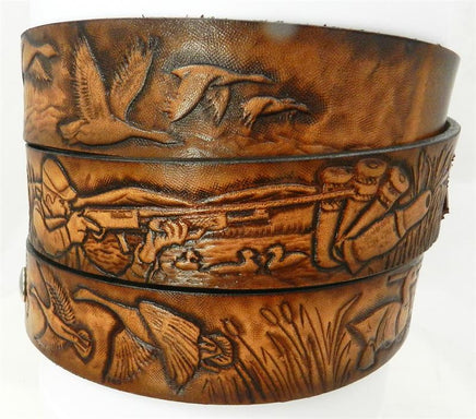 1 1/2" wide Duck hunter Scene Leather Belt. Continuous scene belts are airbrushed with a dark edge and beautifully blended brown center, then proudly hand finished with our exclusive sixteen step finishing process. All of our belts are 100% heavy duty top grain tooling leather. No composite, bonded or glued leather allowed in our factory. Gavere Leather belts are Made in High Springs, Florida USA.