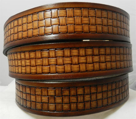 1 1/2" wide Square Basketweave Leather Belt belt is airbrushed with a dark edge and beautifully blended brown center, then proudly hand finished with our exclusive sixteen step finishing process. All of our belts are 100% heavy duty top grain tooling leather. No composite, bonded or glued leather allowed in our factory. Gavere Leather belts are Made in High Springs, Florida USA.