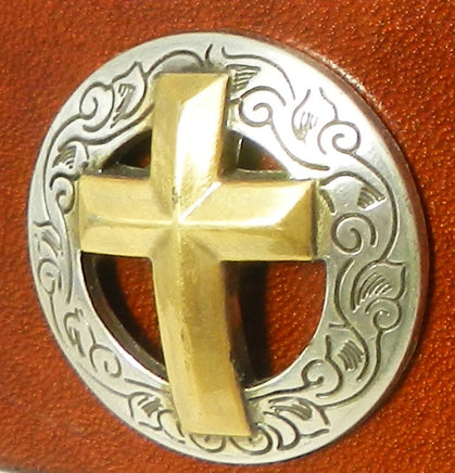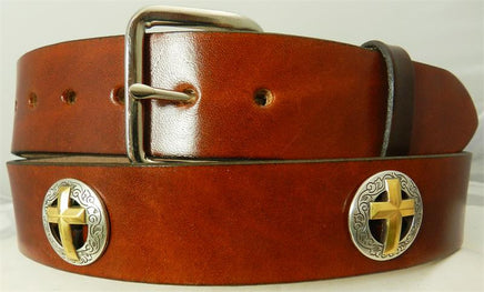 1 1/2" wide. Cross conchos are placed every 5-6" along solid black or brown belt. Belts will hold five to six conchos, depending on size ordered.