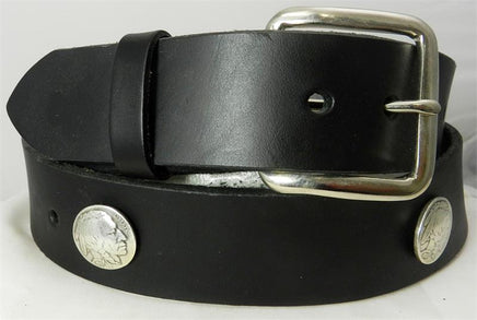 1 1/2" wide belt. Indian Head Nickel conchos are placed every 5-6" along solid black belt. Belts will hold five to six conchos, depending on size ordered.