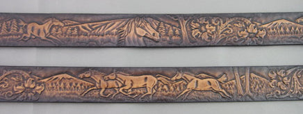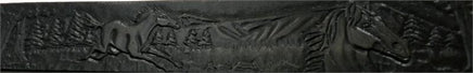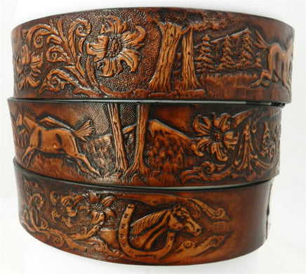 1 1/2" WIDE. Horse scene. When designing name belts, we leave a blank space in the center back of belt to personalize with your name, nickname, company name or wording of your choice. Available airbrushed black/dark grey or a beautiful two tone brown. Like all of our belts, they are made of quality, top grain 9/10 ounce heavy tooling leather and proudly hand finished with our exclusive sixteen step finishing process. Gavere Leather belts are made in USA.