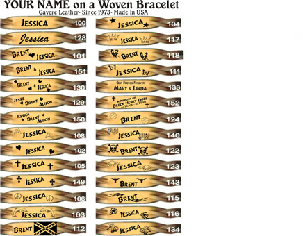 These popular Leather Woven Namebands come in four sizes: Small 6 1/2" - Medium 7 1/2" - Large 8 1/2"- X-Large 9". They are 1/2" wide lightweight top grain cowhide leather. Most popular Leather Nameband is the "couples" bracelet with two names. Also popular is the "In Memory Of" Leather Name Bracelet in honor of those we've lost. Choose from many popular designs to put on each side of the name or names.