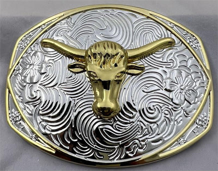 Fits 1 1/2" Belts - Large 3" x 4 " Beautiful large Steerhead buckle. High shine nickel buckle has gilt colored Steer in center and decorative gilt edging.